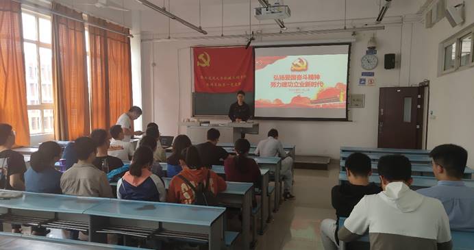 陈杰同志以中组部、中宣部印发的《关于在广大知识分子中深入开展“弘扬爱国奋斗精神、建功立业新时代”活动的通知》为学习纲领,号召全体同志弘扬爱国奋斗精神,努力建功立业新时代。爱国奋斗是当今时代高昂的主旋律,具有深刻的现实意义。习近平总书记反复强调:“知识分子工作是党的一项十分重要的工作”,并在全国组织工作会议上首次把“着力集聚爱国奉献的各方面优秀人才”作为新时代党的组织路线的重要内容,这具有开创性、格局性的重大意义。在新征程、新挑战、新舞台必须弘扬爱国奋斗精神。陈杰同志指出:作为大学生,我们应当强化政治引领,学习近现代科学家的优秀品质,坚定“四个自信”,树立“四个意识”,努力学习知识,培养创新能力,做新时代爱国奋斗精神的践行者。之后陈杰同志播放《开国大典》部分片段,全体同志认真观看并交流感想。