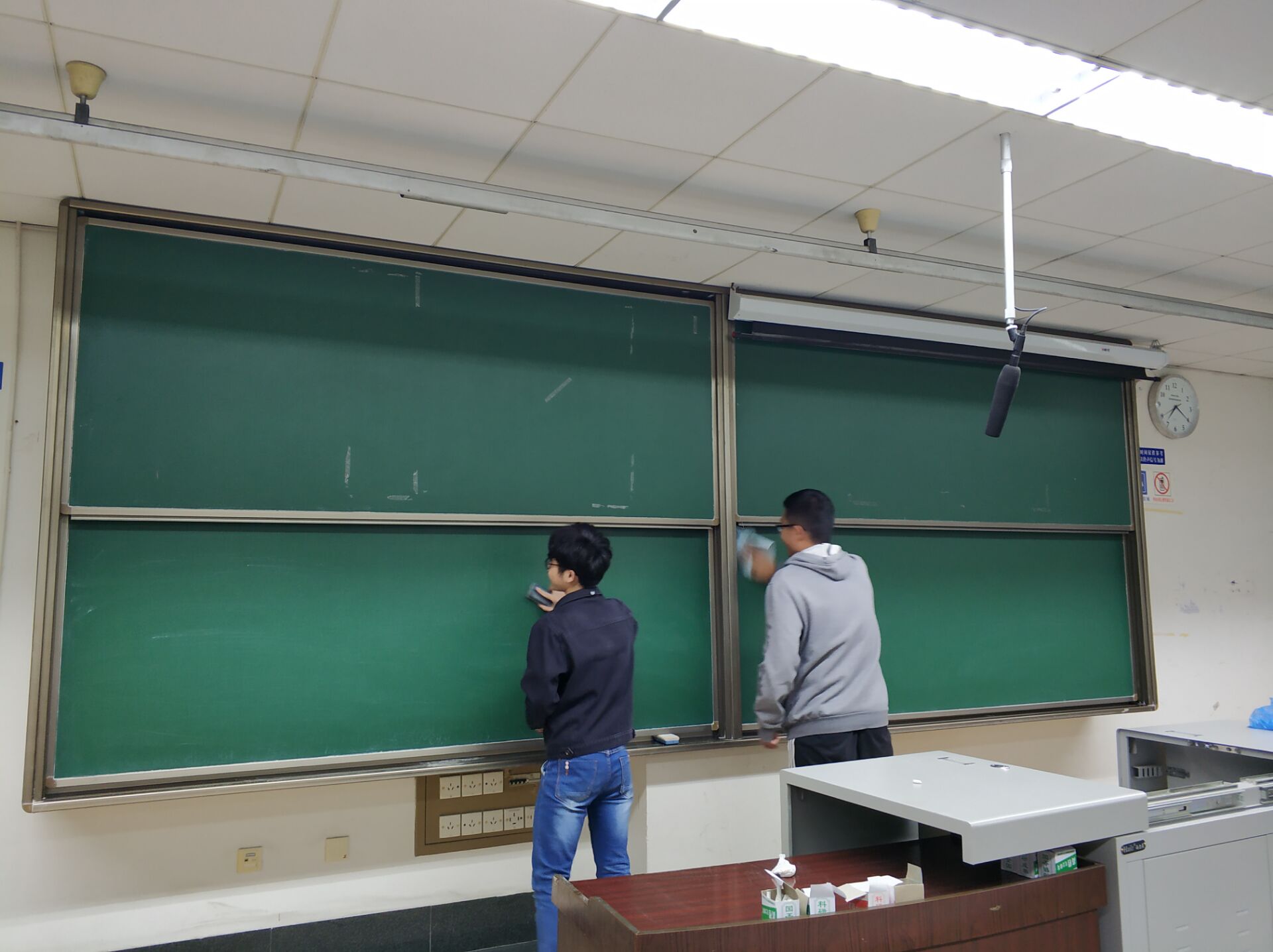 支援服务开始时,同志们先在4405B集合,党支部书记左荣同志说:“每次上完课,我们就离开了,留下了满是知识的黑板,清洁阿姨会拿着抹布一间一间教室擦干净黑板,让下一波来到这里上课的老师更好的传授自己的知识,同学可以及时吸收知识,我们层楼有大约二十多间教室,阿姨清扫会非常累,所以我们今天志愿服务就是帮助阿姨擦黑板,以后同志们也可以常来帮助阿姨擦黑板,减轻阿姨负担。”。之后就分了几组对每一层楼的黑板进行擦拭,擦完之后,有同志说:“擦了两块黑板胳膊就有点酸了,阿姨们真的幸苦了。”,有的同志表示:“可以多开展此类志愿者活动,又能为人民服务,又能促进党支部内部的交流,十分有意义。”。同志们都很认真的擦拭每一块黑板。