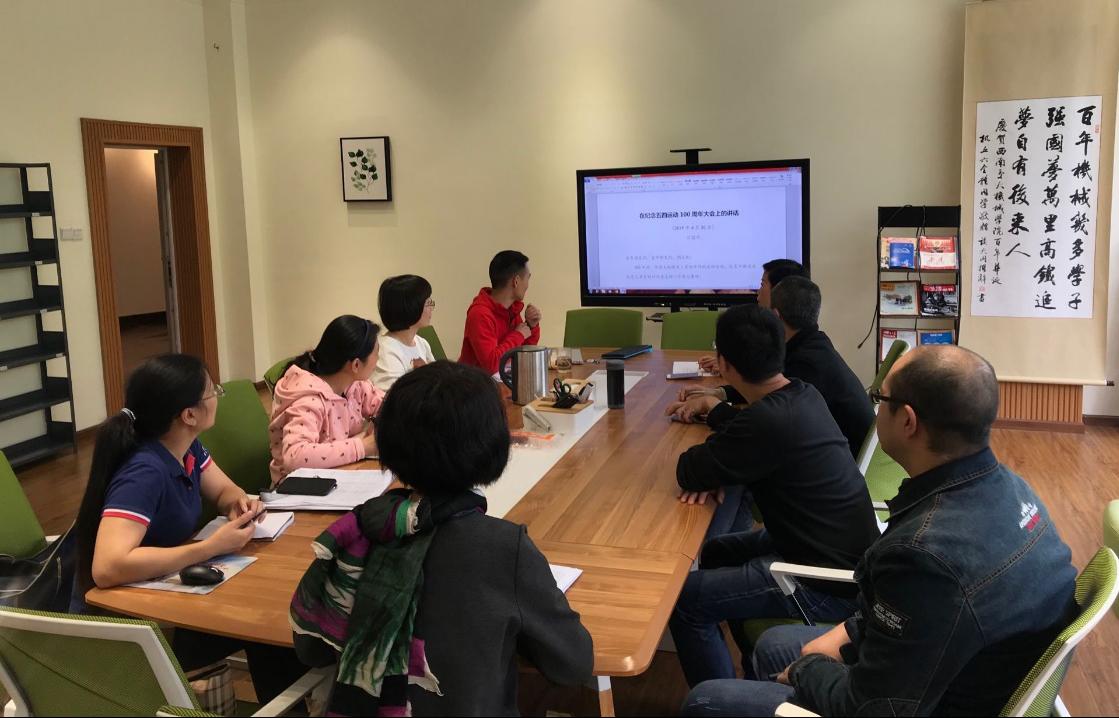 2019年5月9日下午,在九里校区机械工程学院2253教工之家,机关党支部开展了学习“习近平总书记在纪念五四运动100周年大会上的讲话”专题活动。活动由支部书记张亚非主持。