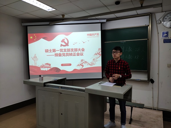 2019年6月13日晚上8点,中共威尼斯7798cc威尼斯7798cc硕士第一党支部在我校九里校区逸夫楼4305A室隆重召开预备党员转正会议。会议由党支部书记谢齐同志主持,支部党员、发展对象和入党积极分子按时出席此次会议。