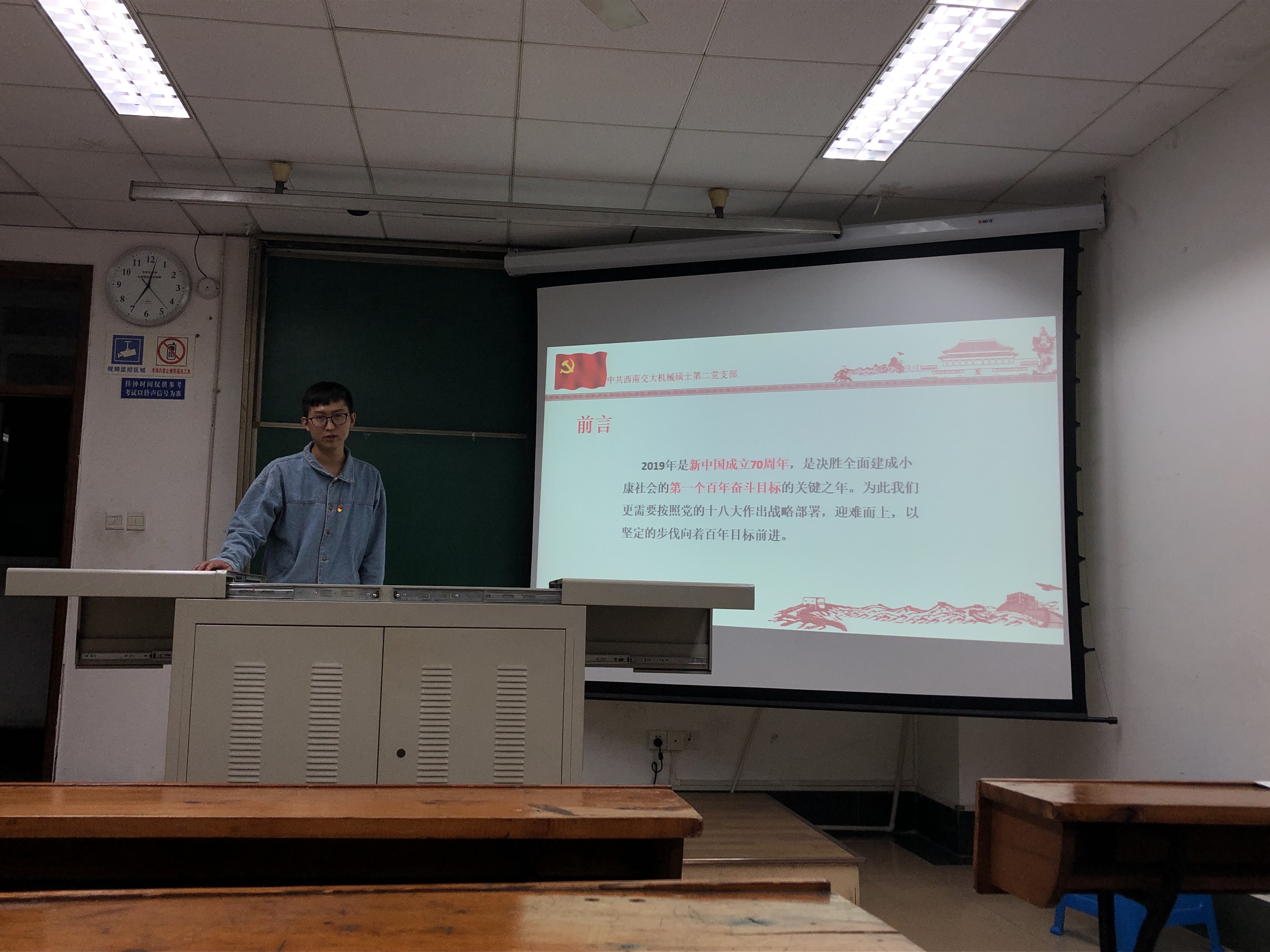 会上,支部书记左荣同志带领大家回顾了新中国成立的历史,带领大家重新学习了新中国成立的意义,新中国的成立壮大了世界和平,民主和社会主义的力量,推翻了帝国主义、封建主义和官僚资本主义的同志,取得了新民主主义革命的胜利,标志着中国民主主义革命的基本结束。2019年是新中国成立七十周年,是决胜全面建成小康社会的第一个百年奋斗目标的关键之年。左荣同志强调:身为党员身为学生,现阶段必须全身心投入到科研中去,夯实专业基础,为以后社会建设贡献自己的力量,在平时学习工作中,要发挥党员先锋模范作用,积极参加党支部活动,不能随意缺席,主动积极地分担党支部工作,时刻学习党支部理论知识,关心党的实时动态,思想同党保持一致。