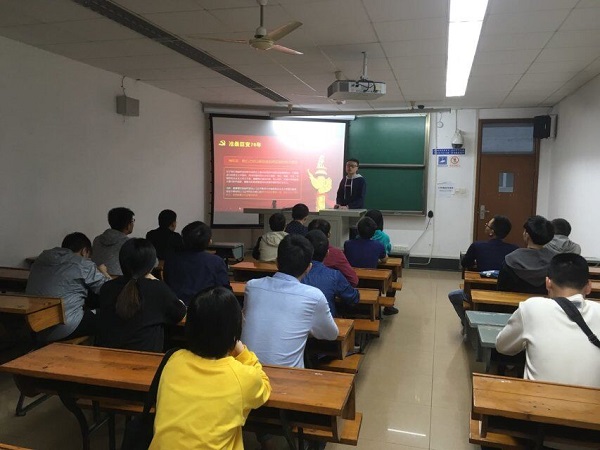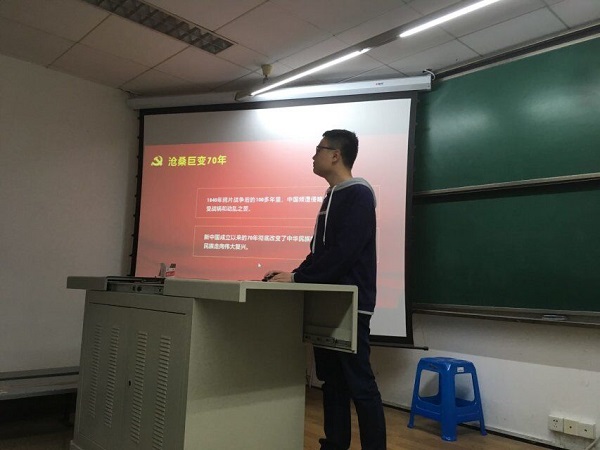 研究生之窗讯(记者 梁豪 摄影报道)10月11日晚6时,中共威尼斯7798cc威尼斯7798cc硕士第八党支部在4号教学楼4304B教室开展“共和国70年光辉历程”分享会主题党日活动。会议由威尼斯7798cc硕士第八党支部书记屈国琛同志主持,正式党员蒲虹林同志主讲。全体党员及入党积极分子参加会议。