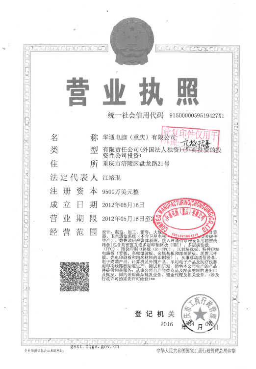 2012年公司产业持续扩张,在重庆涪陵成立华通电脑(重庆)有限公司,以制作高密度电路板(HDI)为主,包括高密度电路板(HDI)的设计、研发、加工、生产、销售等。投产营运后将达到年产印刷电路板165m2/a的生产能力,产品性能及各项质量指针均达到国际先进标准规定要求,产品广泛应用于手机电路板、通讯/网络类电路板、计算机类电路板和消费电子类电路板等。